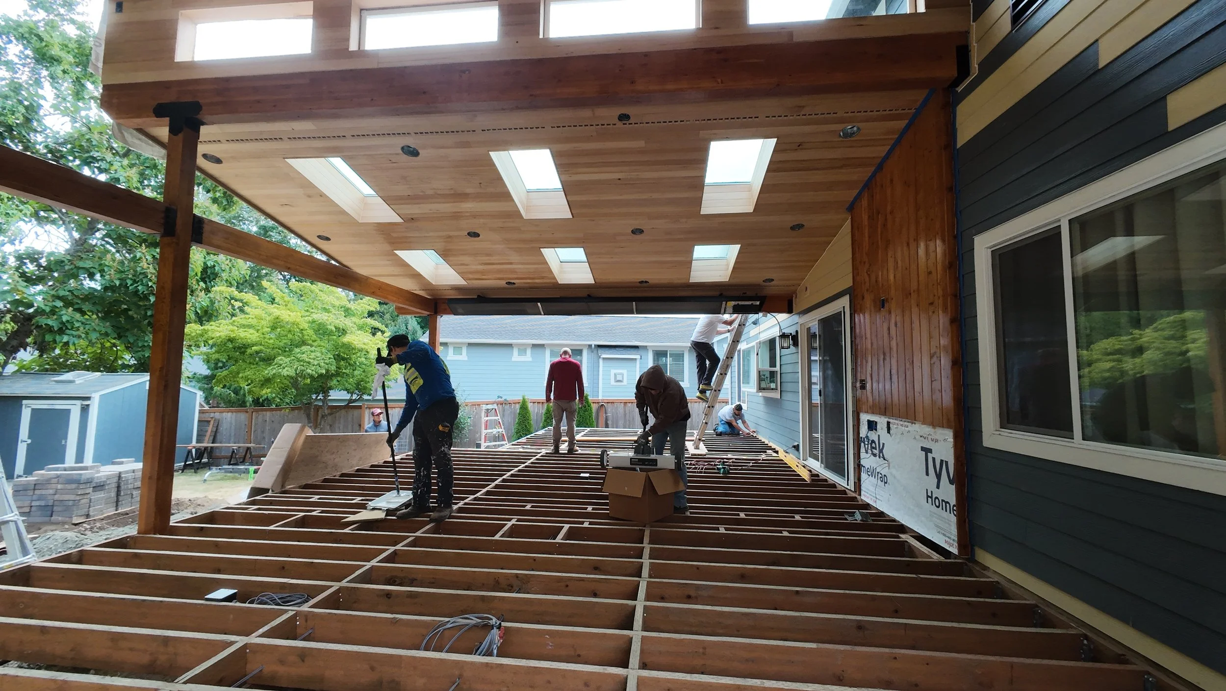 In-progress photo of a dual-angled vaulted outdoor deck ceiling featuring custom hemlock soffits and precision millwork. The build showcases oversized glulam beams, integrated skylights, and a cedar feature wall designed to frame a future BBQ zone and space for outdoor seating area.