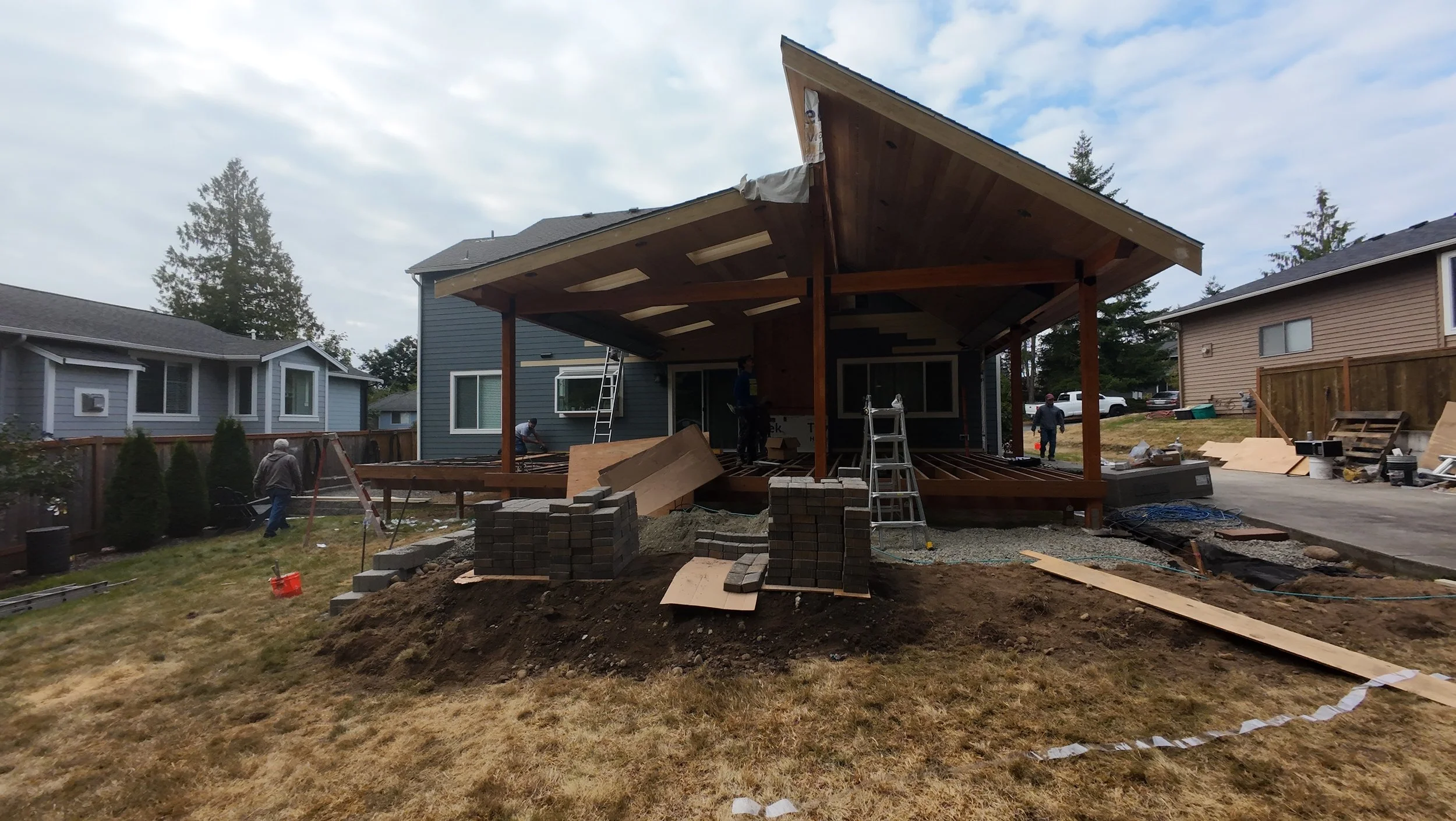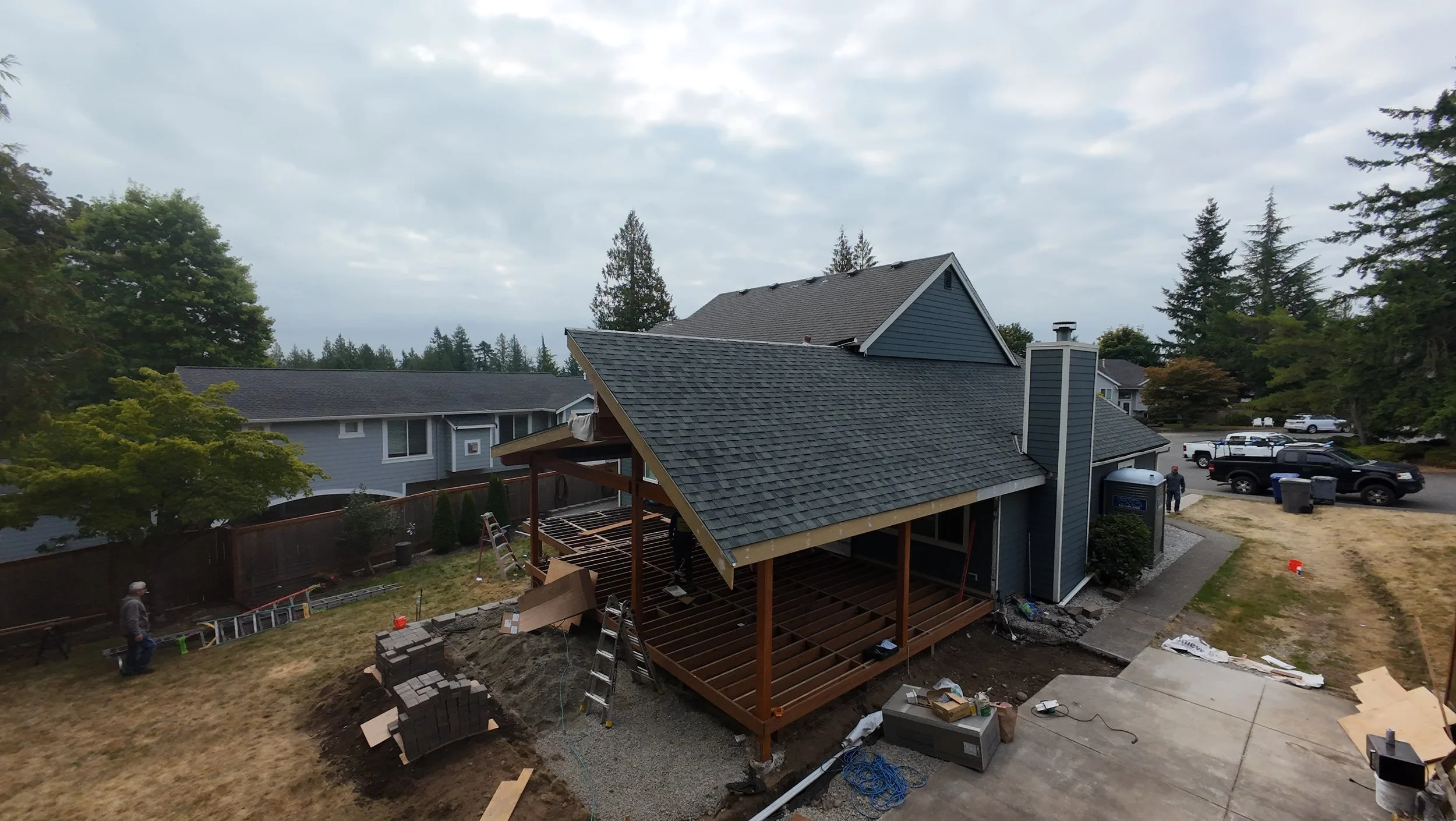 A dramatic, custom roofline that blends perfectly with the home’s existing architecture—creating an open, airy, and visually stunning covered deck that’s become the envy of the neighborhood.