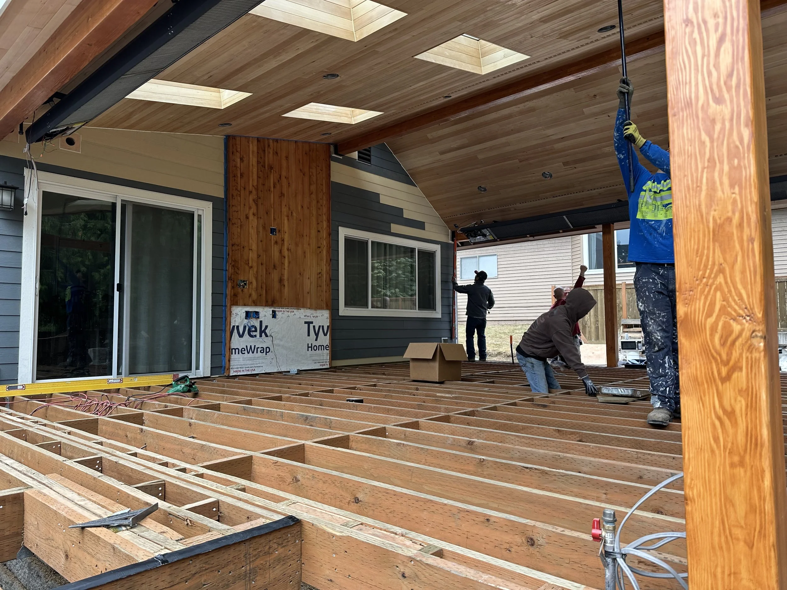 Work-In-Progress: A covered deck build in Sammamish, WA featuring dual angled vaulted roof framing with exposed glulam beams. The structure includes tongue-and-groove soffit installation underway and TimberTech AZEK Vintage decking in Mahogany partially laid. Designed and built by Endura Decking Co, this project showcases premium materials and architectural detailing for a year-round outdoor living space.